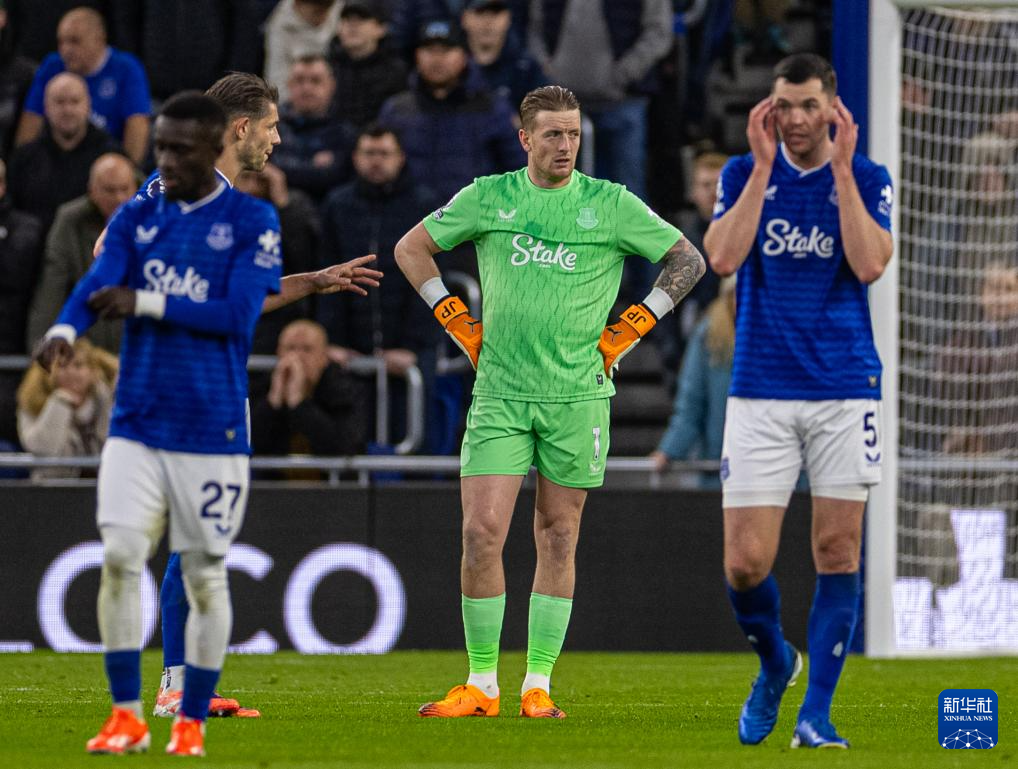10月26日,埃弗顿队门将皮克福德(中)在热刺队进球后神色沮丧。