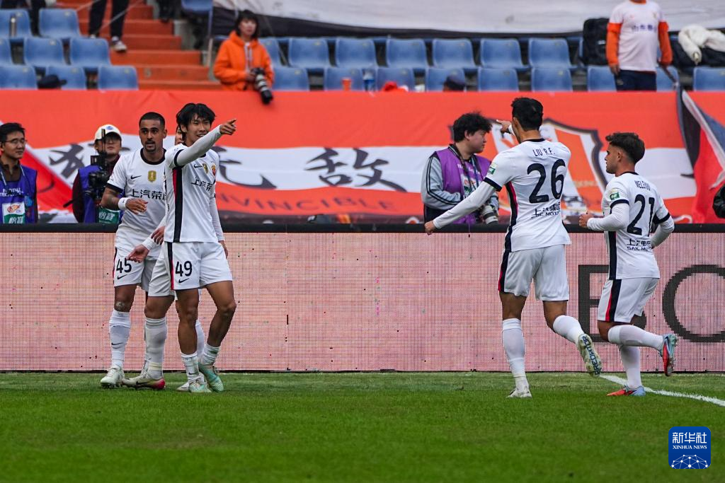 10月26日,上海海港队球员李新翔(左二)在进球后与队友庆祝。