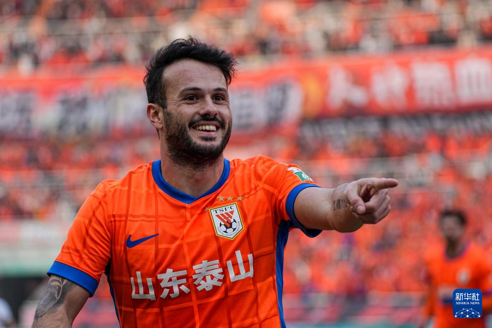 10月26日,山东泰山队球员卡扎伊什维利在比赛中庆祝进球。