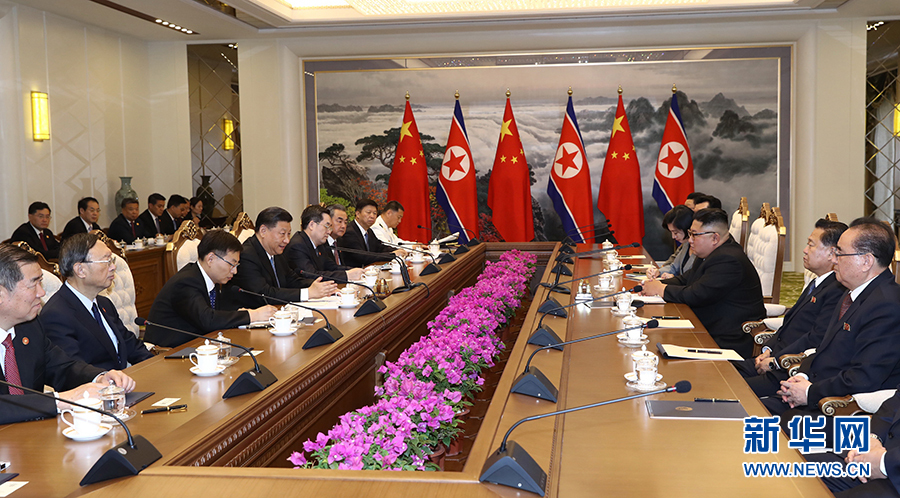 20日下午,錦繡山迎賓館1號(hào)樓會(huì)談廳。習(xí)近平總書記同金正恩委員長進(jìn)行了長達(dá)100分鐘的會(huì)談,就半島問題進(jìn)行了溝通。